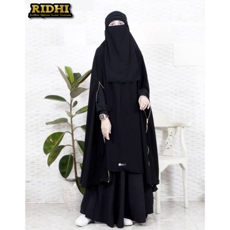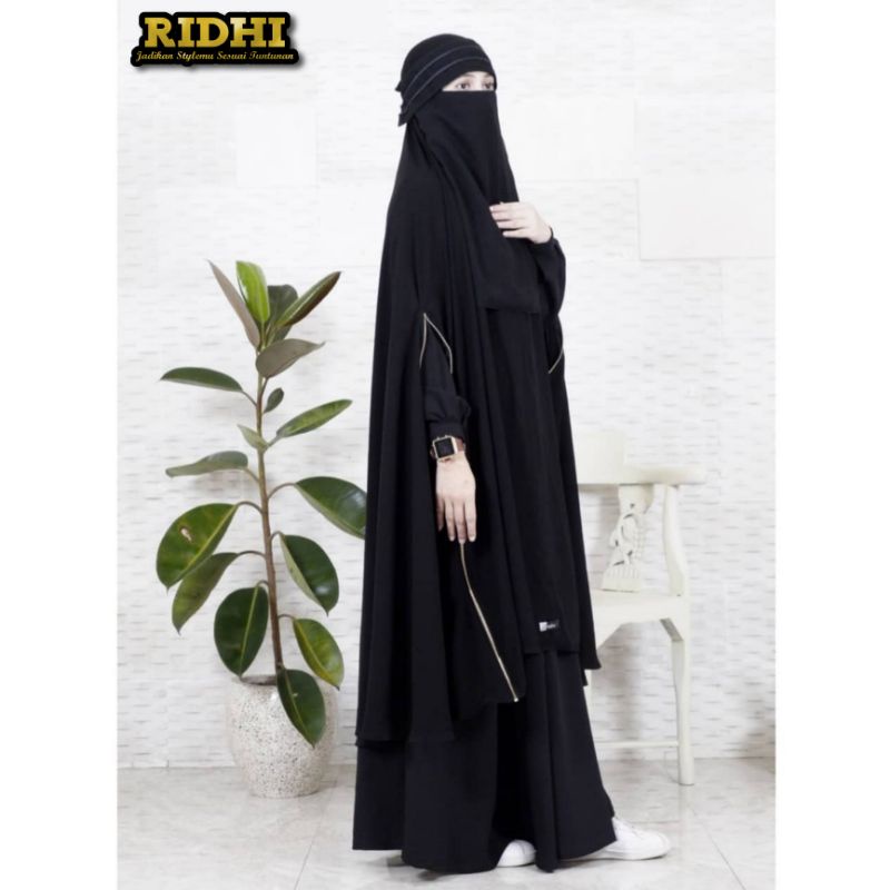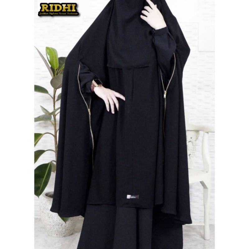 Nama Lengkap | Khimar Jilbab long Super Jumbo Syari Khadijah Zipper Resleting Gold Handsplit lengan belah atau bolong 3 in 1 Jetblack Galeri Ridhi |