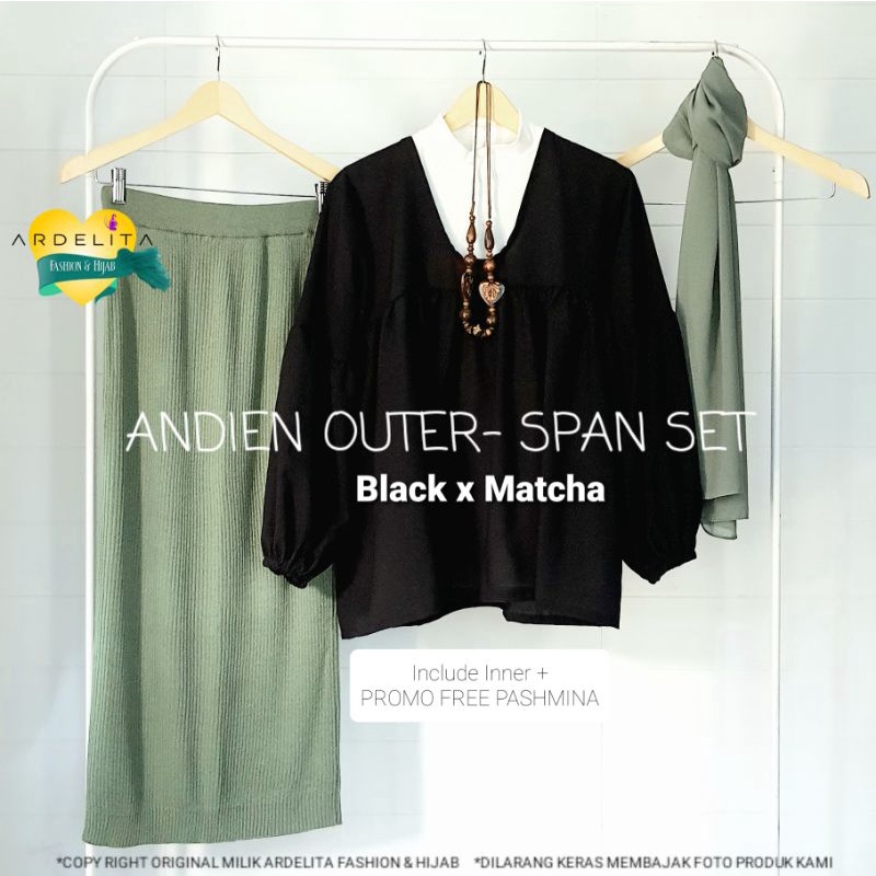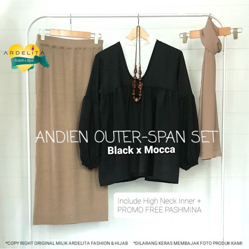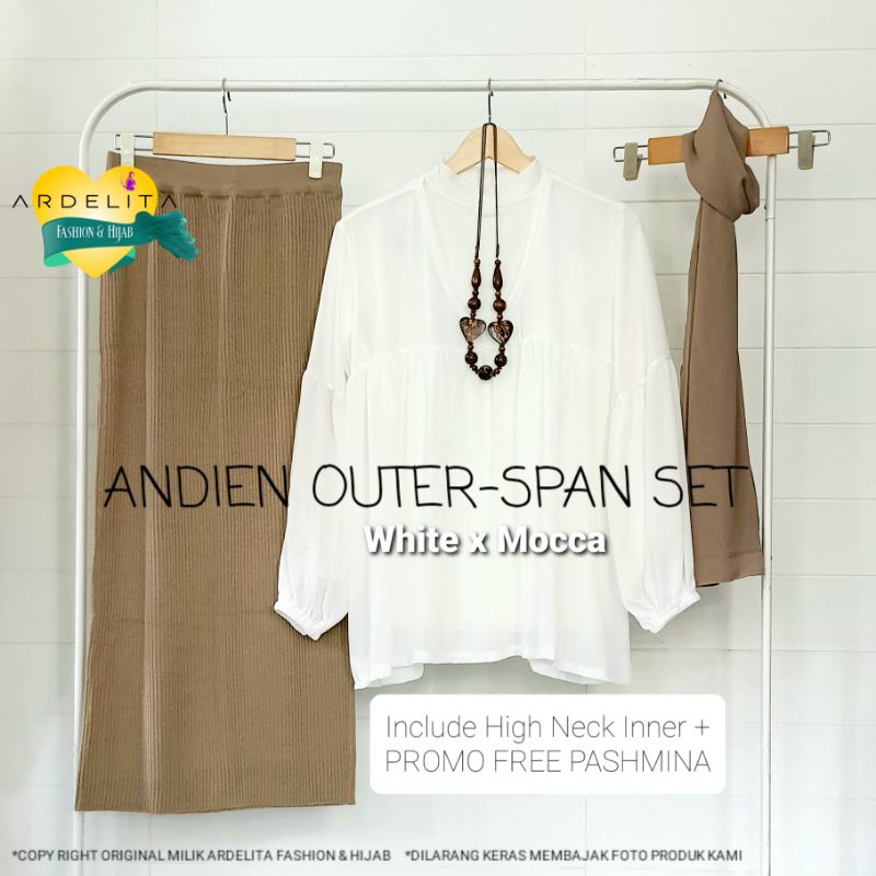 Apa itu ANDIEN SET HEMAT LENGKAP PROMO ORI 100% OUTER SPAN SET FREE PASHMINA/OOTD HIJAB VIRAL SELEGRAM/SETELAN ROK WANITA TERBARU/ OOTD WANITA SET / BAJU OOTD WANITA HIJAB / OOTD WANITA / BAJU SET / SATU SET PAKAIAN WANITA