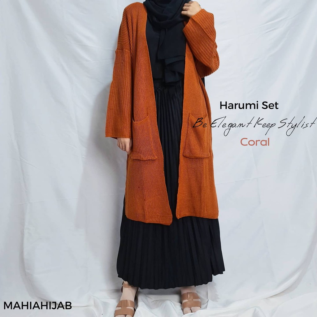 Seputar Harumi one set Long Cardi Rajut + Rok Plisket KOREAN STYLE paket hemat OOTD HIJAB, SETELAN LENGKAP