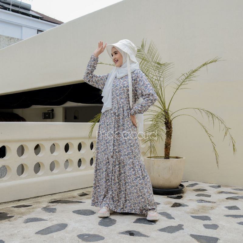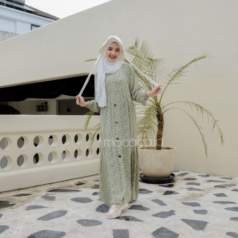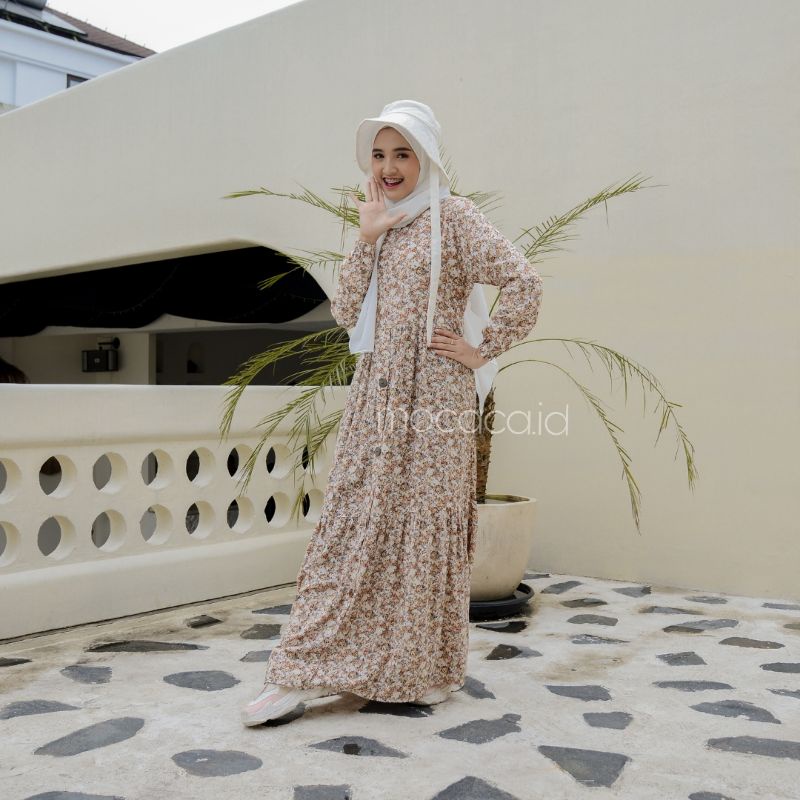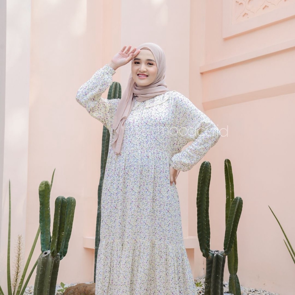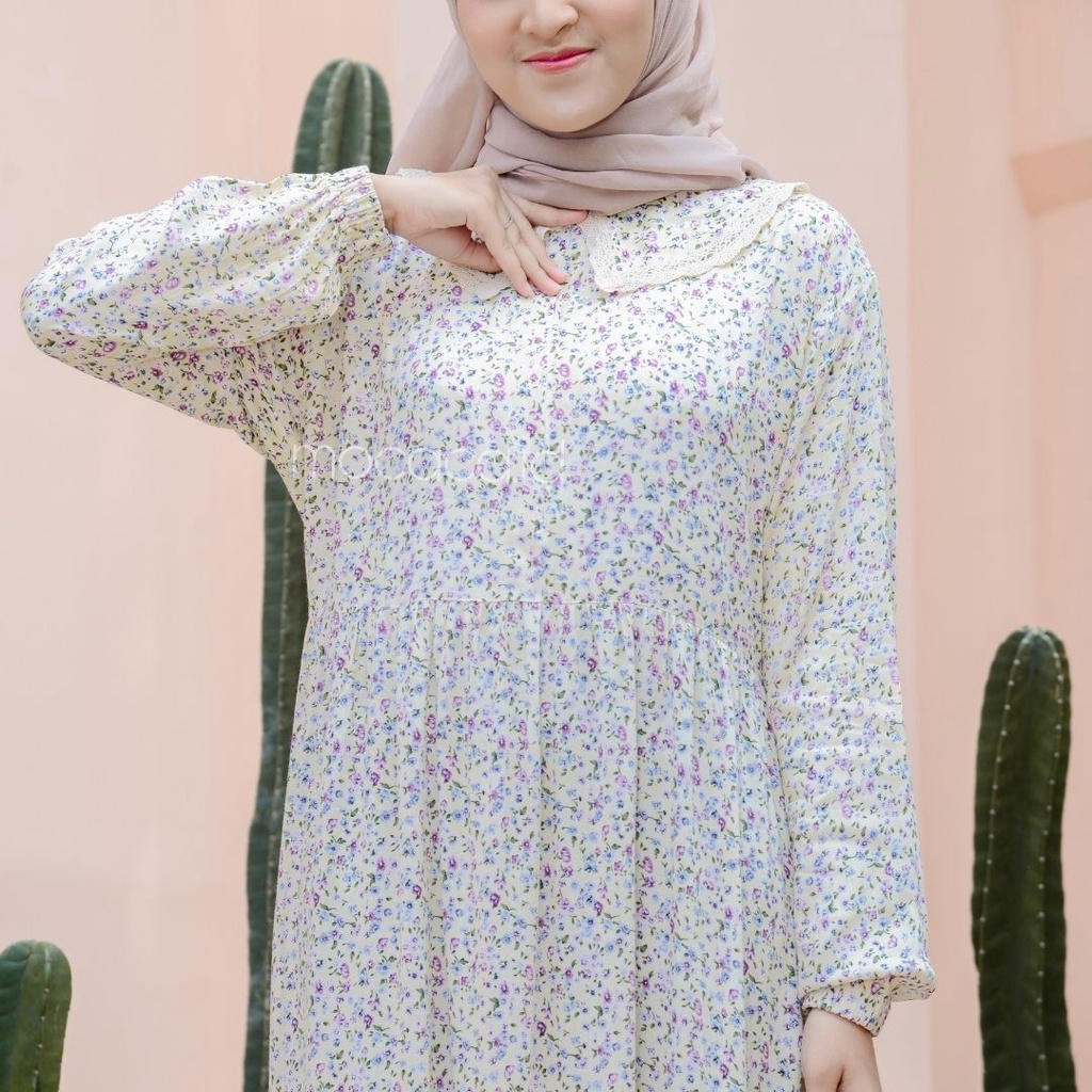 Nama Lengkap | Home Dress Rumahan OOTD Hijab motif Shabby Pastel Kuning Peach Rayon Premium busui Friendly Kerah Renda Collar lengan karet besar |