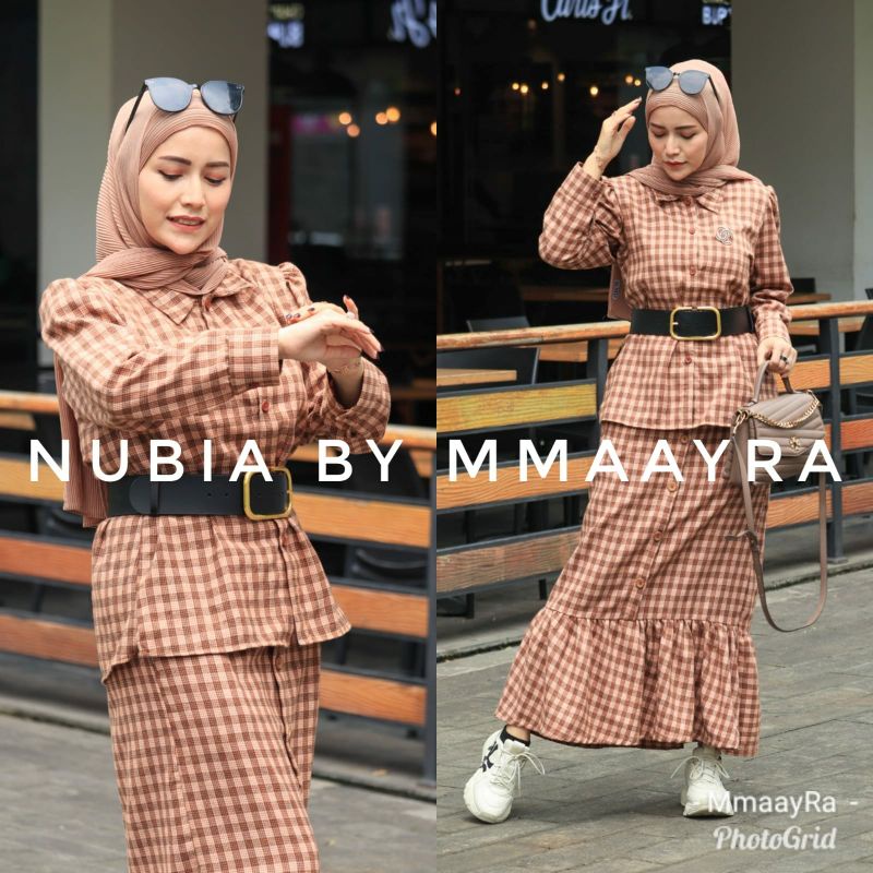 Apa itu nubia by mmaayra setelan kemeja dan rok bahan soft flanel ootd hijab